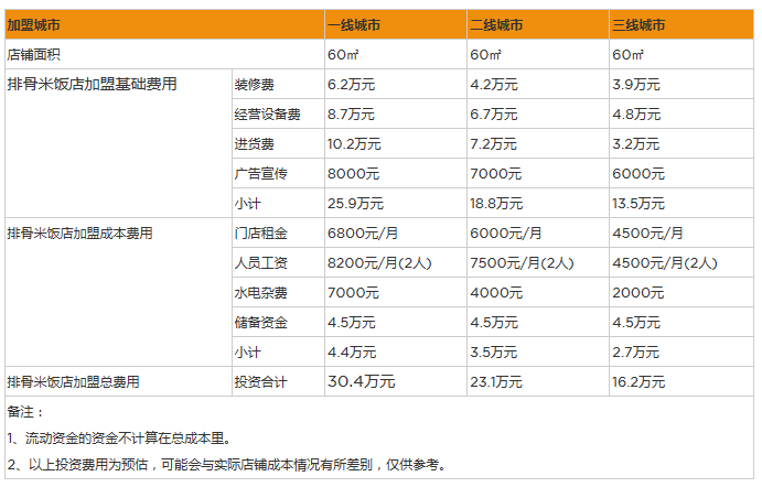 先是加盟費(fèi)用,根據(jù)調(diào)查,開一家排骨米飯的費(fèi)用為16萬(wàn)元,包括了這幾項(xiàng)內(nèi)容: