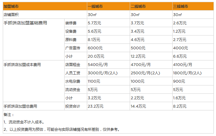 而店鋪的裝修和餐具費用一般需要3-5萬元。當前,在二三線城市,餐營業的服務人員工資在2500元左右,30平方米的店鋪最多招一個員工。有門市的店鋪每月的水電費至少也在800元。不算流動資金,開一家30平方米的手抓餅店需要準備至少8萬元。
