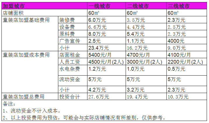 開家童裝店投資大概多少錢?60㎡成本預算花費10萬元